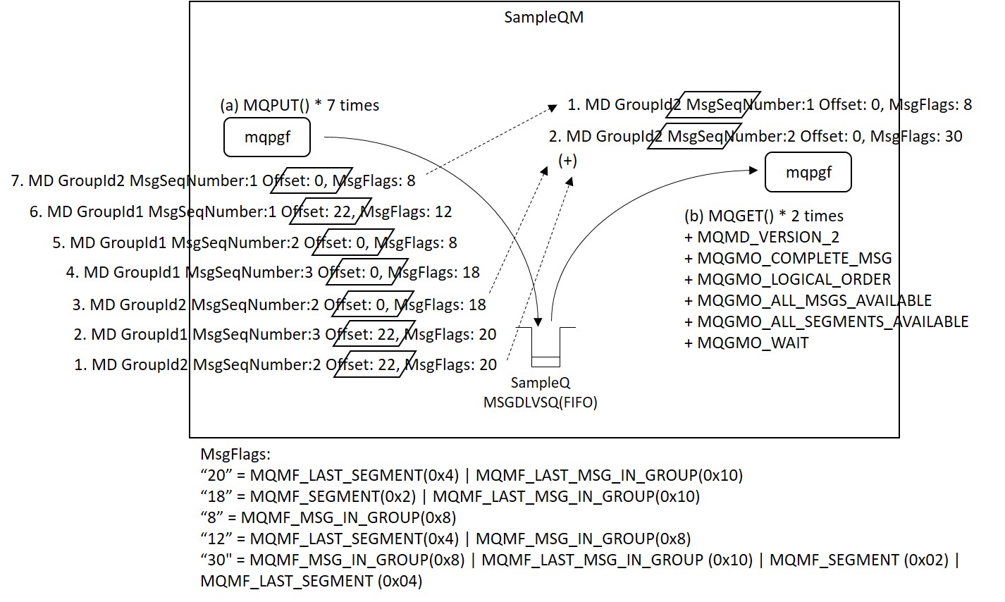 mqpgf -qm SampleQM -q SampleQ -m Group2Logical2Segment2 -gi GroupId2 -ms 2 -of 22 MQMD_VERSION_2 MQMF_LAST_SEGMENT MQMF_LAST_MSG_IN_GROUP